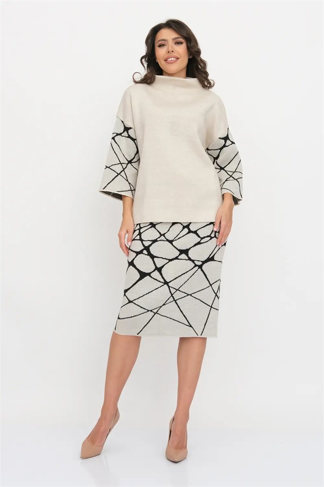 Женский трикотажный костюм, состоящий из жакета и юбки. Жакет выполнен жаккардовым переплетением, рукава молочные с черным узором-паутинкой длиной 7/8, горловина лодочка-стойка. Юбка длиной 62 см молочно-черная, как и рукава изделия.
