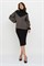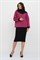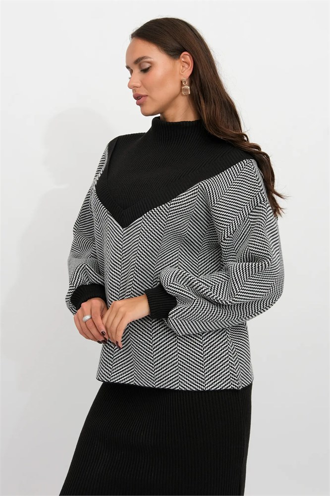 Женский трикотажный костюм состоит из жакета и юбки. Жакет выполнен жаккардовым переплетением, образующим рисунок-ёлочку. К глубокому V-образному вырезу пришита манишка-стойка, вывязанная "лапшой". Объемные рукава со спущенным плечом, манжеты вывязаны переплетением-резинка. Длина джемпера 63см, юбки-75см.
