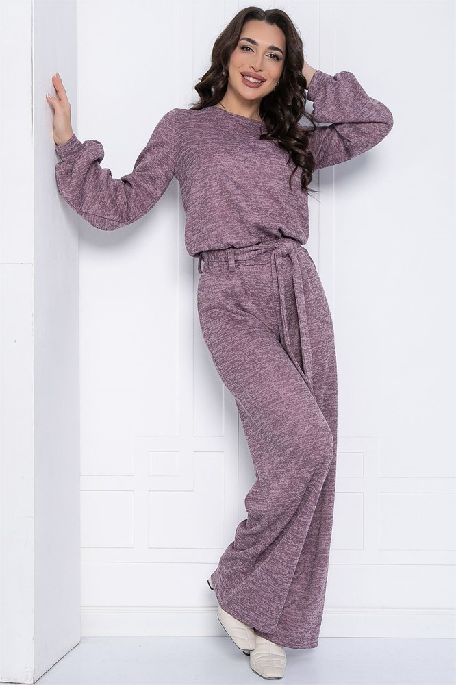 Повседневный костюм из трикотажного полотна «Ангора» свободного кроя прекрасно впишется в ваш гардероб. Джемпер с округлой горловиной и пышными рукавами на манжете — это воплощение уюта и стиля. Брюки свободного кроя с притачным поясом на резине со шлёвками. Костюм дополнен поясом, который можно использовать как с брюками, так и с джемпером. В таком костюме можно смело отправиться на прогулку или на встречу с друзьями. Целый день вам будет уютно и комфортно.