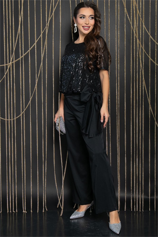 Нарядный костюм создан для тех, кто ищет универсальный и торжественный образ. Верх костюма представлен свободной блузкой с завязками на нижней части. Она выполнена из трикотажа с пайетками, которые придают образу особую праздничность и торжественность. Брюки прямого силуэта со свободной посадкой дополнены резинкой на талии и функциональными карманами, что делает костюм стильным и модным, подходящим для различных мероприятий. Этот брючный костюм-двойка можно легко адаптировать к различным ситуациям — от праздничного ужина до повседневной носки. Бант по низу блузки является несъемной частью изделия.