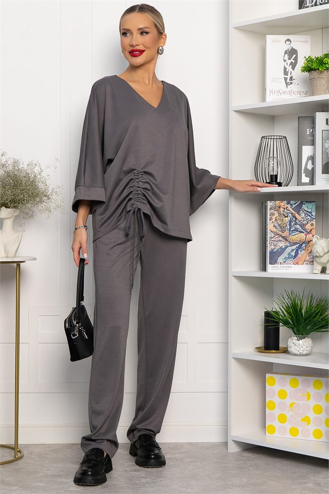 Стильный и удобный женский брючный костюм из трикотажа в серых тонах — это то, что нужно для создания модных и комфортных образов на каждый день! Блузка с V-образным вырезом подчёркивает линию шеи и визуально удлиняет её. Рукава цельнокроеные, с удобными манжетами. По переднему полотну проходит кулиска, которая придаёт костюму современный вид. Брюки на талии с резинкой и боковыми карманами — это практичное решение для повседневной жизни. Они удобны и функциональны, что делает этот костюм идеальным выбором для любых дел, встреч или отдыха. Этот костюм станет прекрасным дополнением вашего гардероба. Он подчеркнёт вашу индивидуальность и подарит ощущение уверенности и комфорта в любой ситуации.