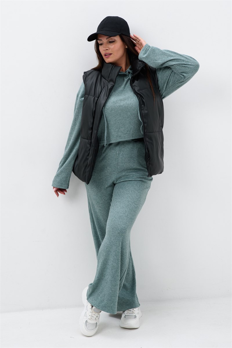 Женская двойка, изготовленная из приятной и плотной ткани - ангорка-лапша. Кофта костюма с капюшоном на шнурках, и длинным спущенным рукавом, свободные брюки палаццо с высокой посадкой и мягкой резинкой на поясе. Данная модель подойдет для прогулок и для дома, она достаточно уютная и комфортная, хороший выбор для вашего гардероба.