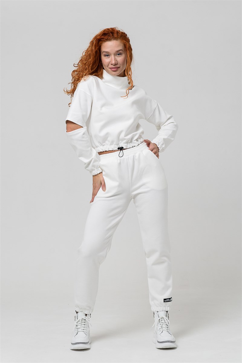 Костюм состоит из укороченной толстовки и брюк. У толстовки воротник стойка, на рукавах в районе локтей разрезы, нашивка между шеей и плечом. Низ толстовки стянут на кулиску с фиксатором. На брюках два косых кармана, низ и верх выполнены резинкой.