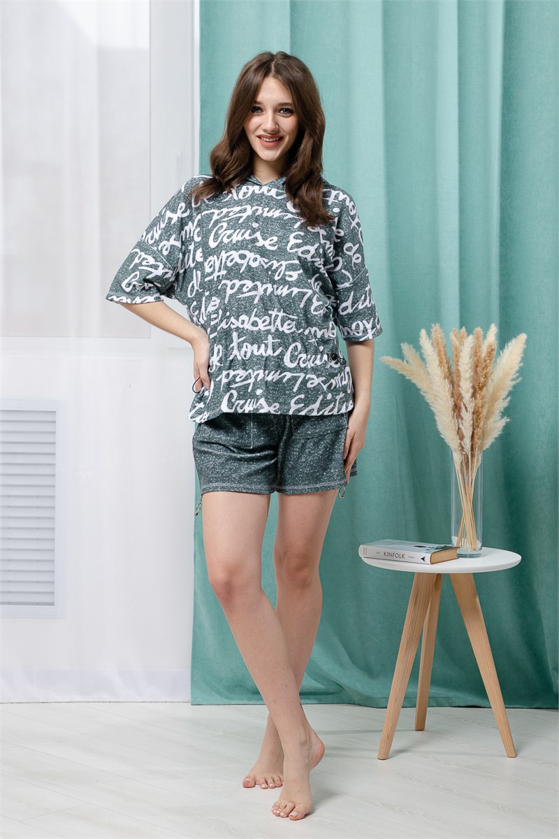 Костюм состоит из туники и шорт. Туника прямая, свободная, с резинкой по талии, с ушками на капюшоне, с разрезами в нижней части боковых швов. Рукав короткий. Шорты прямые, на поясе, с накладными карманами спереди. Вдоль боковых швов расположены молнии.