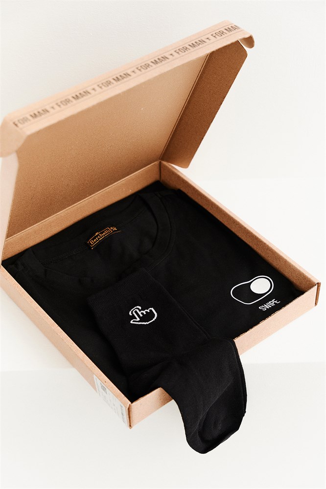 Подарочный набор СВАЙП. Черная мужская футболка с принтом и носки с принтом подчеркнут вкус и чувство юмора. Подарочный набор упакован в крафтовую коробку с тематическим принтом. Футболка из 100% хлопка подойдет для повседневной носки и для выхода из дома. Мужская футболка подойдет для занятий спортом и для активных прогулок. Футболка будет отлично сидеть практически на любой фигуре. Носки подойдут к любой одежде и обуви. Изготовлены из высококачественного хлопка, который отлично впитывает влагу, пропускает воздух и подходит даже для самой чувствительной кожи. Хорошо сохраняют форму и цвет, устойчивы к истиранию. Подарочный набор СВАЙП будет отличным подарком второй половинке, близкому другу, отцу и дедушке. Размер носков 40-47.