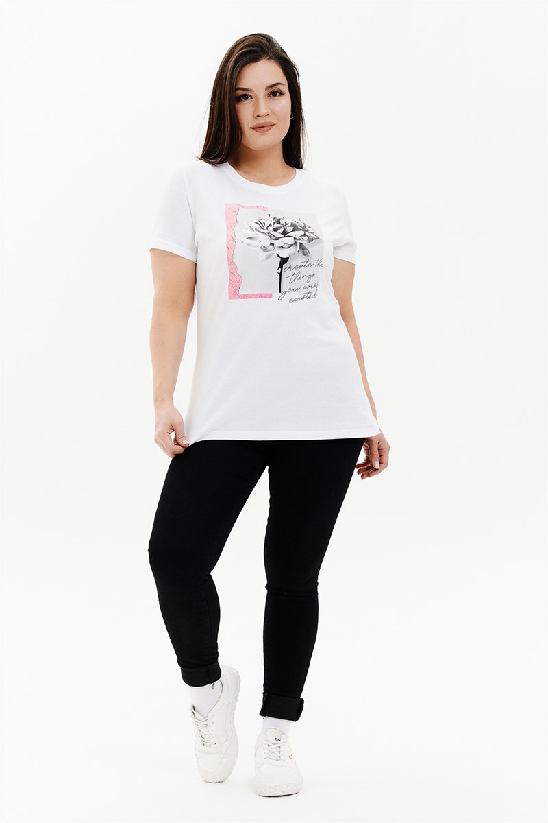 Подарочный набор РОЗОВЫЙ ЦВЕТОК. Белая женская футболка с принтом и носки с принтом подчеркнут вкус и чувство стиля. Подарочный набор упакован в крафтовую коробку с тематическим принтом. Футболка из 100% хлопка подойдет для повседневной носки и для выхода из дома. Футболку будет удобно носить навыпуск или заправлять, отлично сочетается с юбкой, брюками с джинсами, а также можно надеть под пиджак, жакет или кардиган. Футболка будет отлично сидеть практически на любой фигуре. Носки подойдут к любой одежде и обуви. Изготовлены из высококачественного хлопка, который отлично впитывает влагу, пропускает воздух и подходит даже для самой чувствительной кожи. Хорошо сохраняют форму и цвет, устойчивы к истиранию. Подарочный набор РОЗОВЫЙ ЦВЕТОК будет отличным подарком второй половинке, близкой подруге, маме или сестре. Рост модели на фото 165 см, размер 48. Размер носков 23-25.