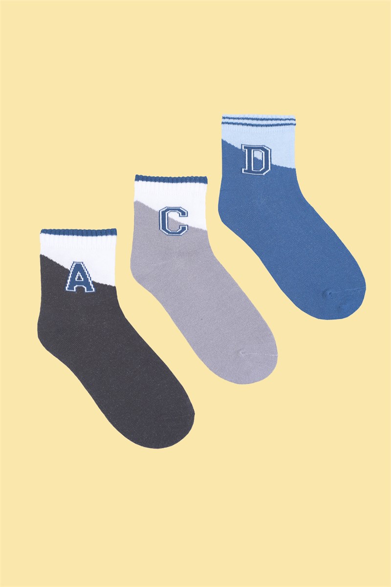 Носки детские с вязаными рисунками в виде букв. В комплекте 3 пары: черные, серые и синие, по 1 каждой расцветки. Состав ткани: 80% х/б, 17% п/а, 3% эластан. Возможен заказ в розницу. Арт. НД277