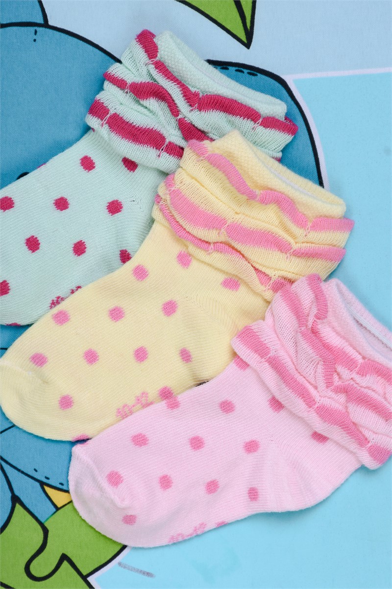 Набор нарядных носков для девочек. По резинке объемная рюша, по всему носку вывязан горошек. В упаковке 3 пары - по 1 паре каждой расцветки (желтый, ментол, розовый)
