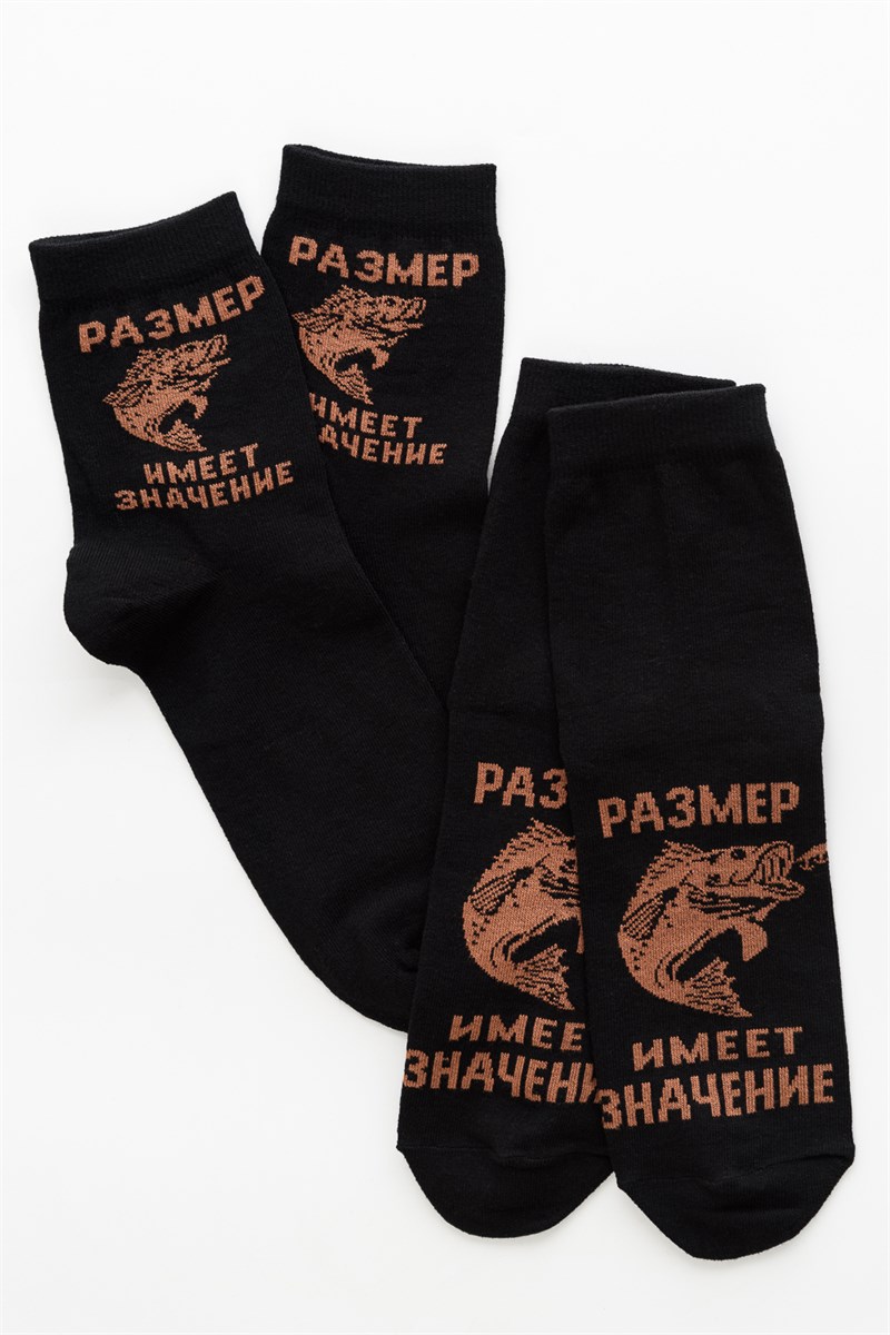 Комплект 2 пары мужских носков. Отличный подарок для мужчин, братьев, дедушек и друзей на праздник. На верхней части носка изображение рыбы и надпись Размер имеет значение