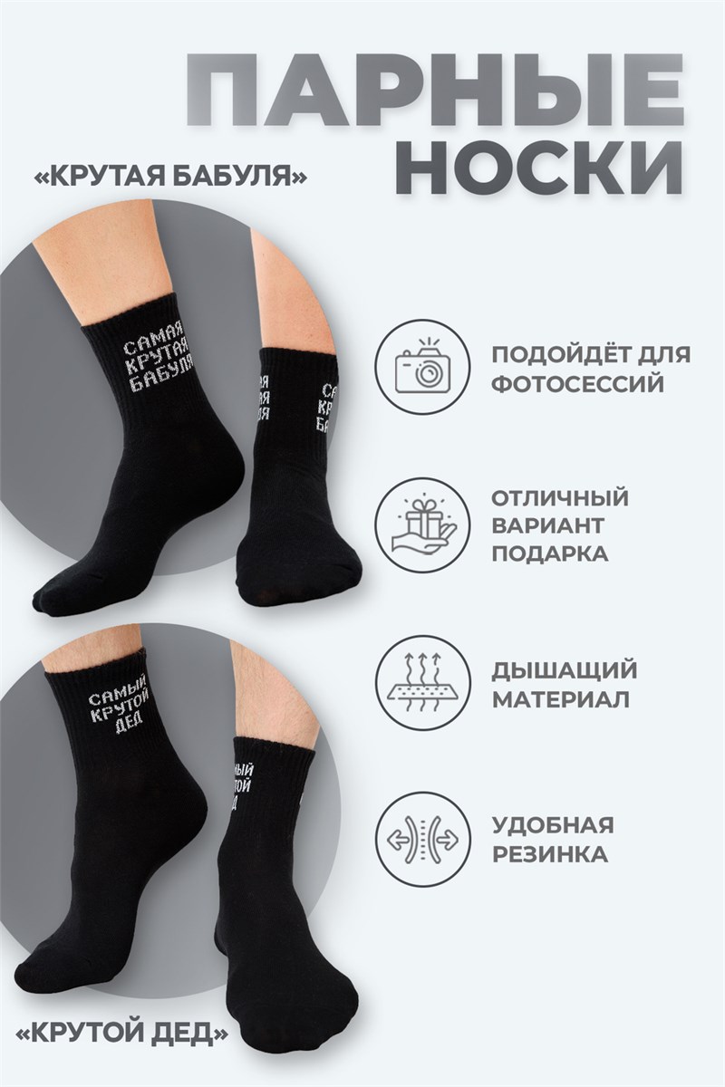 Комплект мужских носков одна пара. Широкая резинка по всей верхней части носка. На резинки надпись самый крутой дед