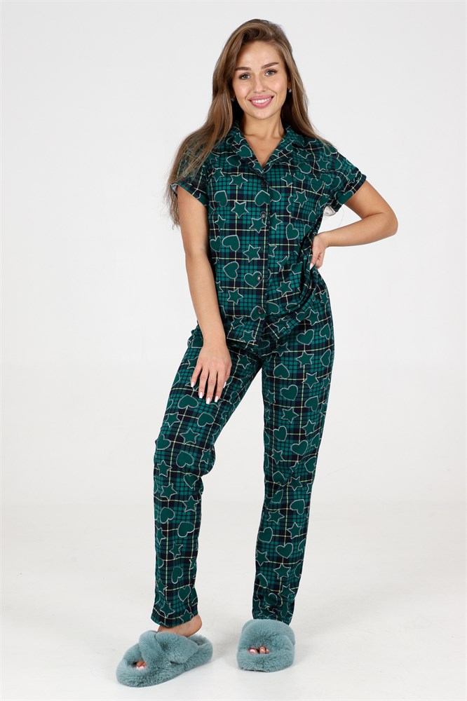 Классная удобная пижама на каждый день с кофточкой на пуговицах, отложной воротник, короткий рукав на манжете, брюки прямого кроя.