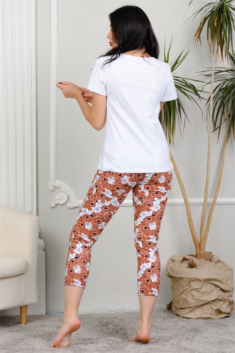 Удобный хлопковый костюм для дома и дачи. Футболка не стесняет движений, на полочке милый принт. Брючки с завышенной талией с кармашками длиной 3/4. Прекрасный комплект для каждодневного использования.