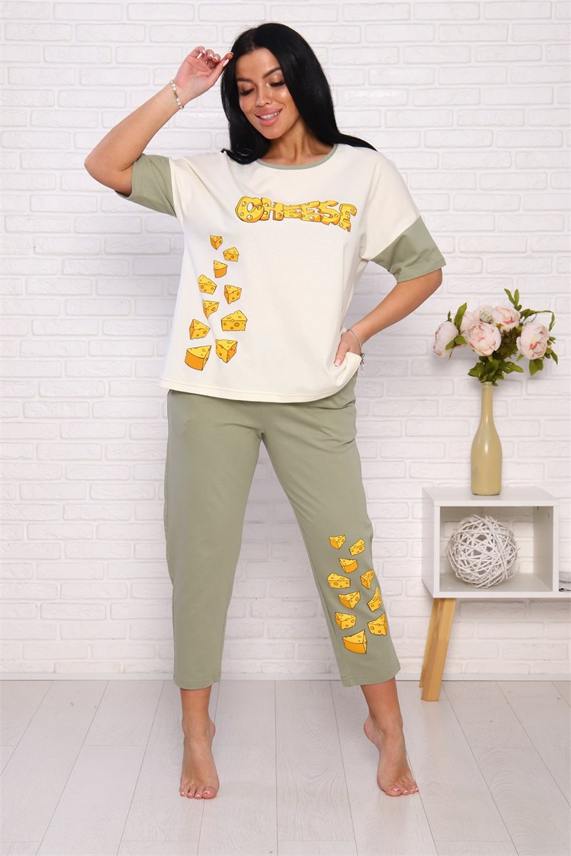 Пижама женская Сыр: футболка с аппетитным принтом на груди и короткими рукавами, брюки длиной 7/8, прямые с карманами в боковых швах и на комфортном широком мягком поясе. 100% хлопок - комфорт и стиль.