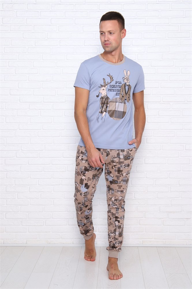 Пижама мужская: брюки с боковыми карманами, заужены к низу, манжет из рибаны; футболка с коротким рукавом и со стильной печатью на груди.