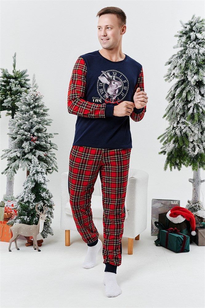 Пижама мужская свободного силуэта состоит из кофты и брюк. На полочке принт. Брюки на манжете. В боковых швах карманы.