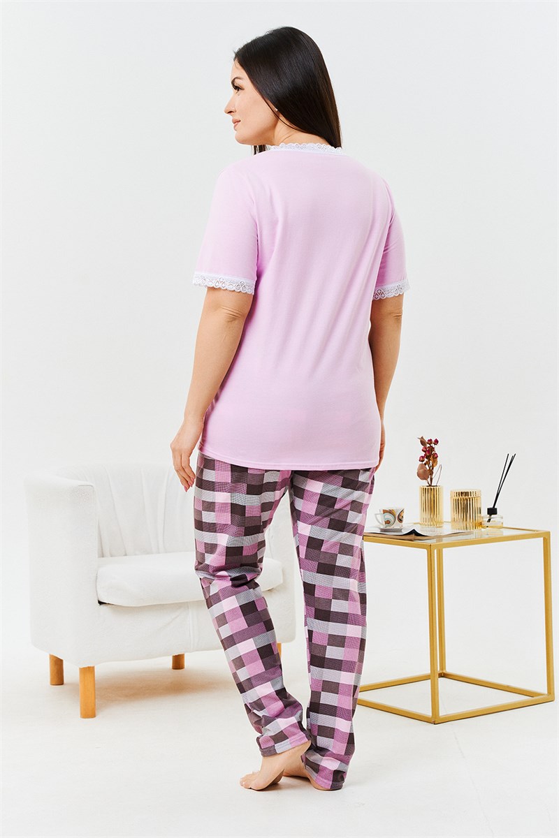 Пижама женская из кулирки 100% хлопок состоит из г/к футболки и брюк. Футболка нежного оттенка с V-образным вырезом, горловина и рукава обработаны красивым эластичным кружевом белого цвета. Брюки из набивной кулирки в клетку, могут быть с боковым швом. Пижама подходит для сна и дома, комфортная, удобная, не меняет цвет после стирки. Рост модели на фото 165см, размер 48