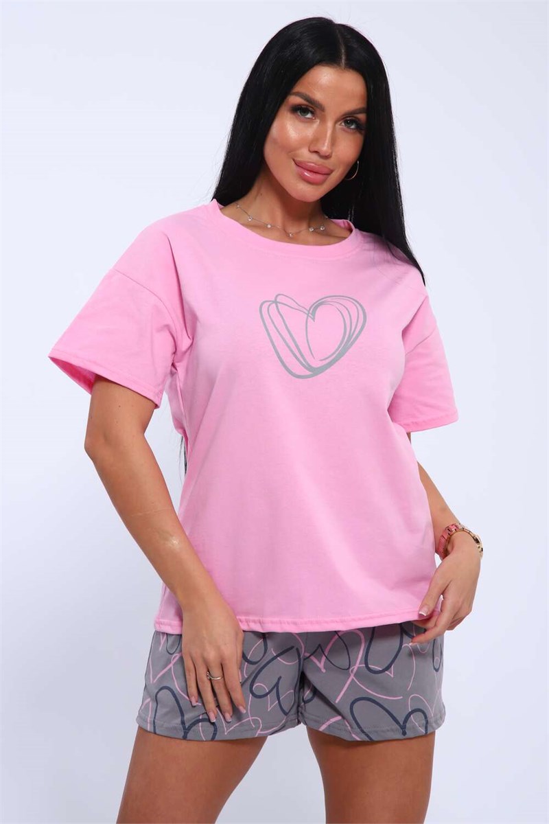 Пижама женская с принтом. Состоит из футболки и шорт.
