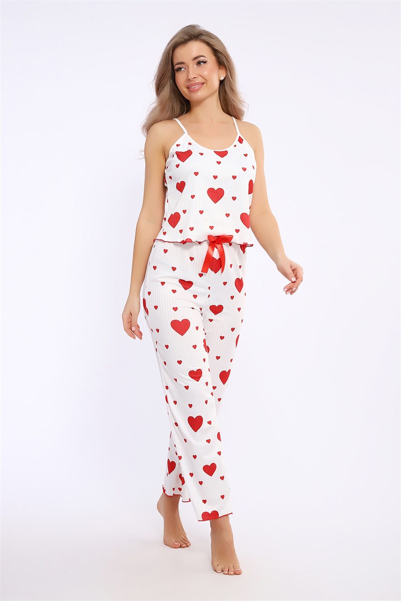 Каждый элемент этой пижамы тщательно продуман для максимального удобства. Топ имеет аккуратный вырез, а брюки обеспечивают свободу движений. Дизайн пижамы украшен милыми сердечками, что придаёт образу уют и теплоту.