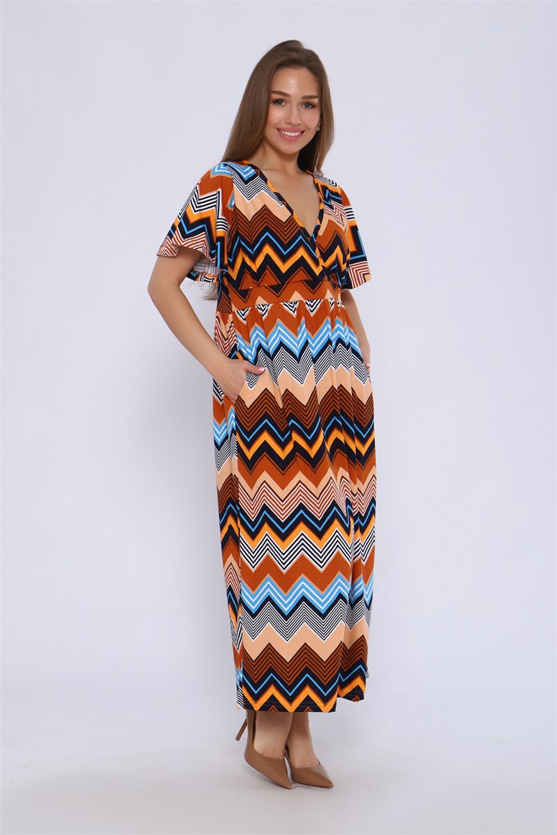 Длинное платье с короткими расклешенными рукавами. Лиф запашной со сборкой над грудью. Юбка так же на сборке.
