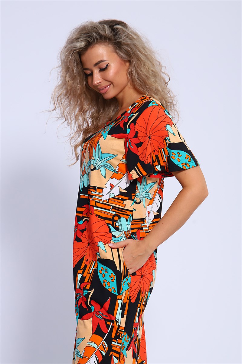 Длинное платье полуприлегающего силуэта с короткими рукавами - крылышками. В боковых швах карманы и разрезы.