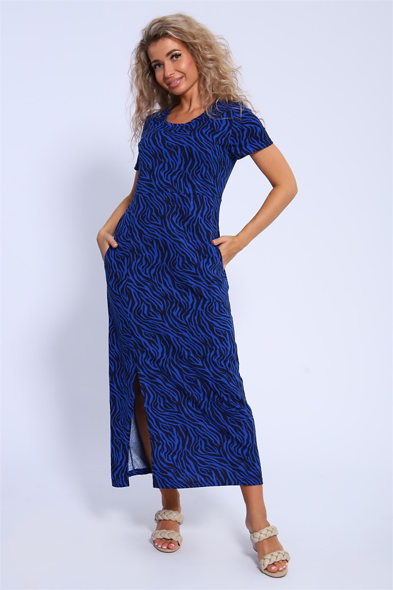 Платье полуприлегающего силуэта с короткими рукавами. Спереди разрез на ноге. В боковых швах карманы.