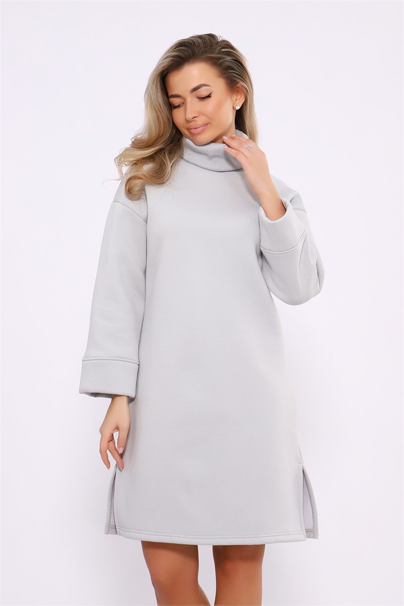 Платье полуприлегающего силуэта с укороченными рукавами, воротником стойкой и разрезами в боковых швах.
