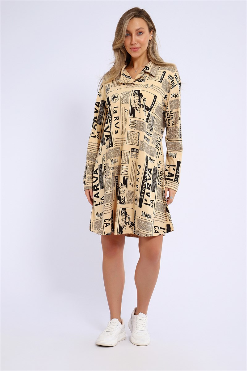 Платье свободного кроя расклешенное к низу и с рубашечным воротником. Рукава длинные, на манжетах.