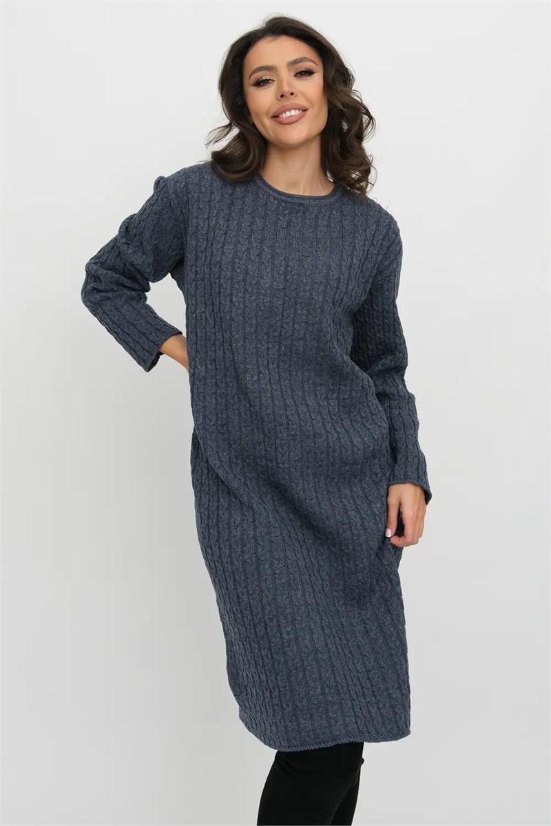 Женское трикотажное платье свободного силуэта со спущенным плечом. Вырез горловины круглый, рукава втачные длинные. Платье выполнено переплетением, образующим узор-вертикальные косы.