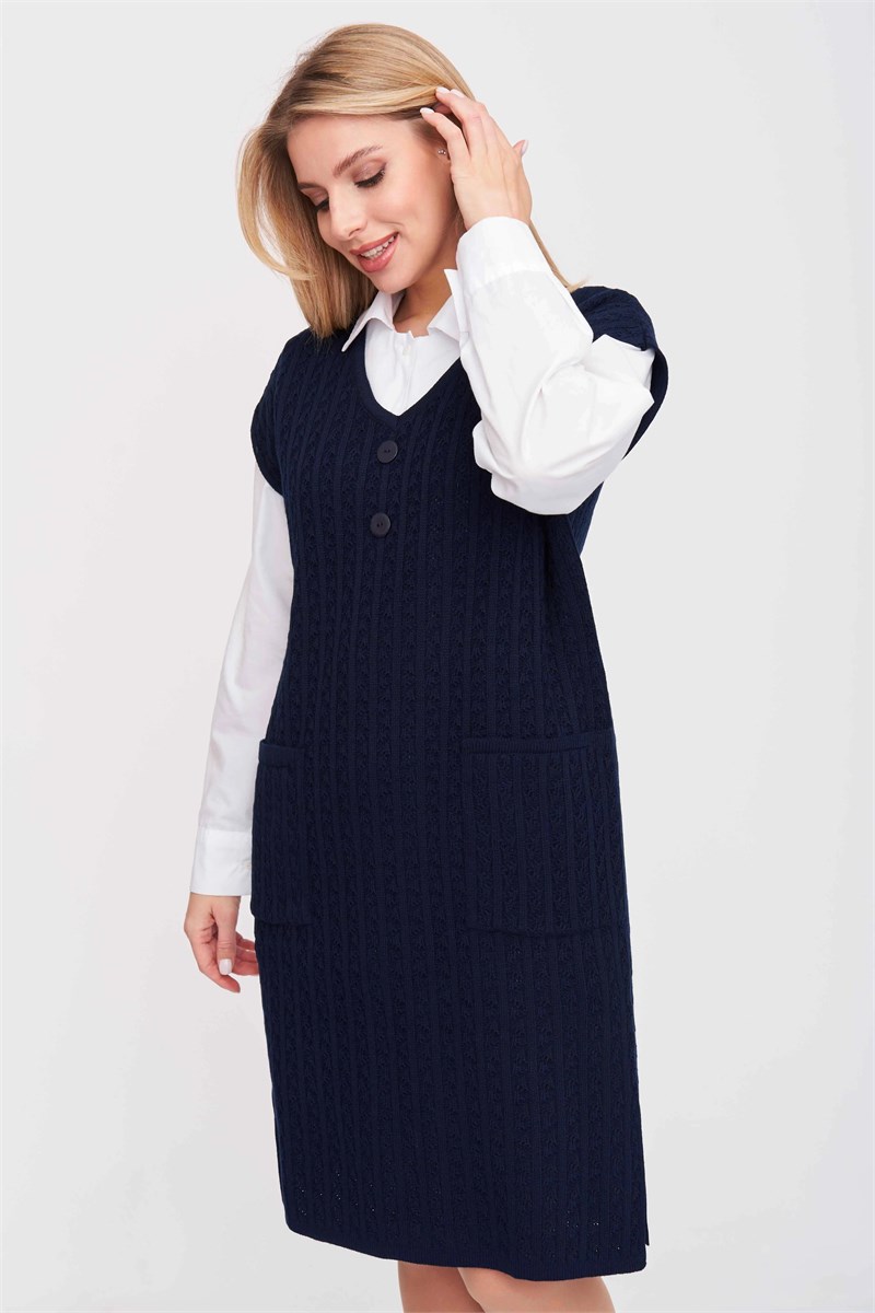 Женский вязанный сарафан длиной до колена и разрезами по боковым швам. Плечо спущенное без рукавов с v-образным вырезом горловины. По центру переда расположены декоративные пуговицы. Сарафан выполнен структурным переплетением.