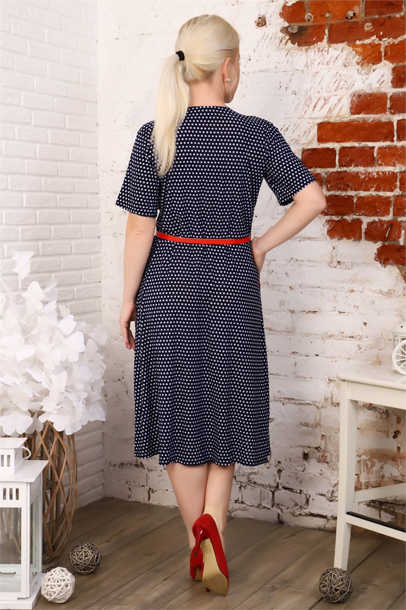 Платье с отрезной юбкой на складках с карманами, на карманах красная отделка, V-образный вырез, короткие рукава, на полочке передней декоративные красные пуговицы. Летнее, удобное и приятное к телу платье. Пояс в комплекте