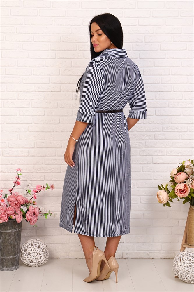 Платье рубашечного покроя, отложной воротник. Рукав 3/4 на манжете. В боковых швах изделия разрезы