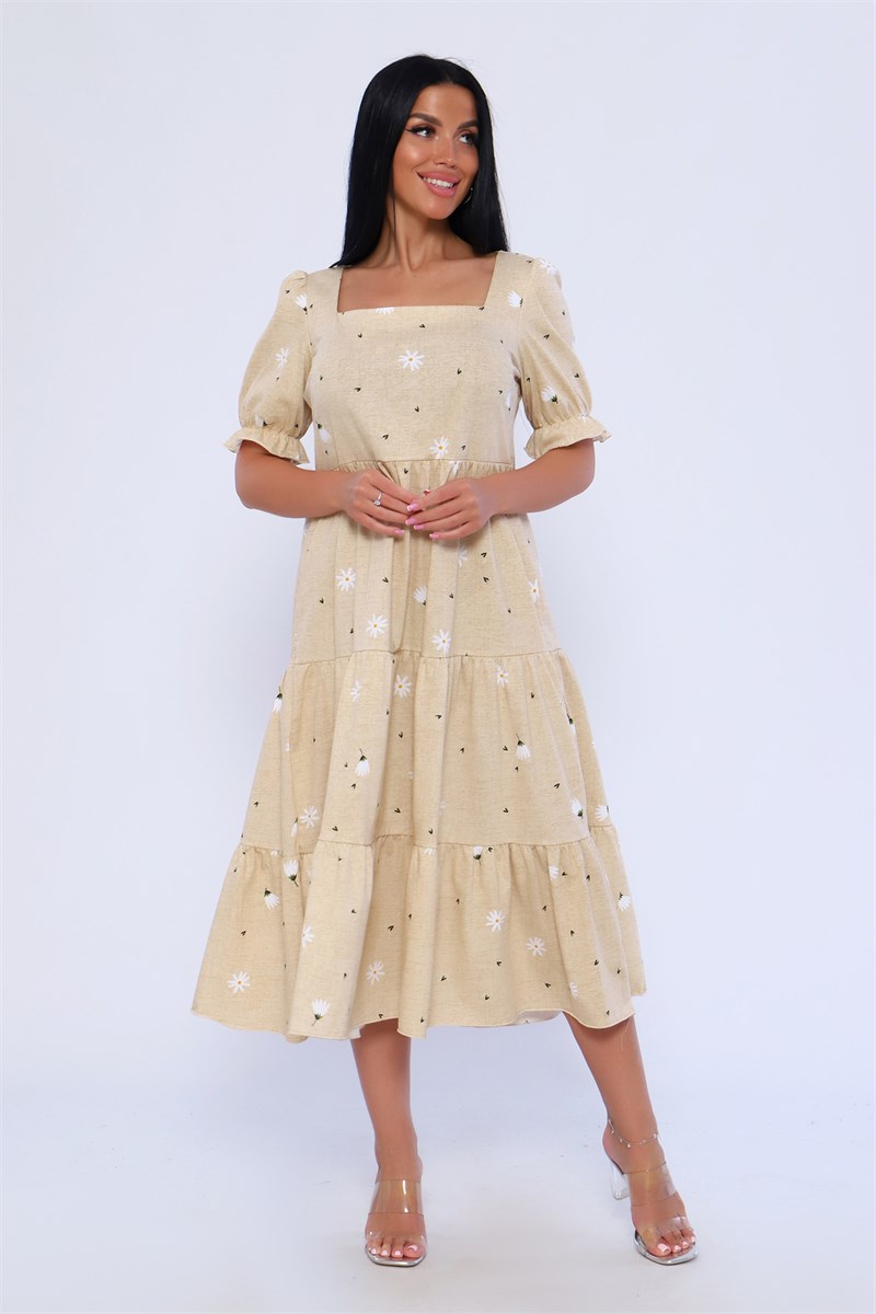Легкое и дышащее летнее платье из хлопка. Платье в длине миди с пышными рукавами и квадратным вырезом подчетркивает декольте и визуально удлинняет шею. Платье А-силуэта состоит из нескольких соединенных рядов-ярусов, линия талии платья чуть завышена. Модель не сковывает движения и комфортно садится по фигуре. Оно универсально и может быть использовано как вечернее, так и повседневное платье. На моделе представлен 46 размер. Параметры модели 165 см,97-71-101