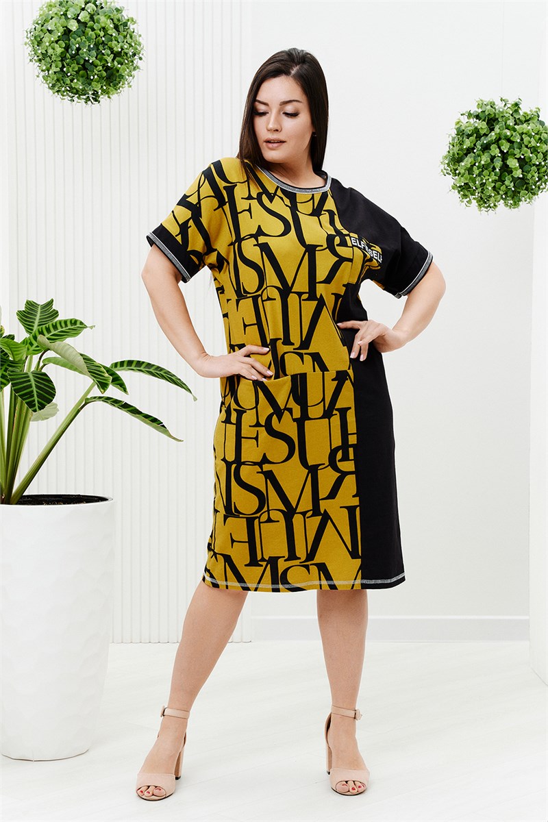 Платье женское полуприлегающего силуэта, рукав цельнокроенный короткий. Полочка состоит из трех частей. Левая боковая часть из контрастной отделочной ткани, сверху расположен нагрудный карман с настроченной на него тесьмой. С правой стороны полочки в горизонтальном шве внутренний карман. Круглый вырез горловины и манжеты рукава окантованы бейкой из отделочной ткани и белым кантом.
