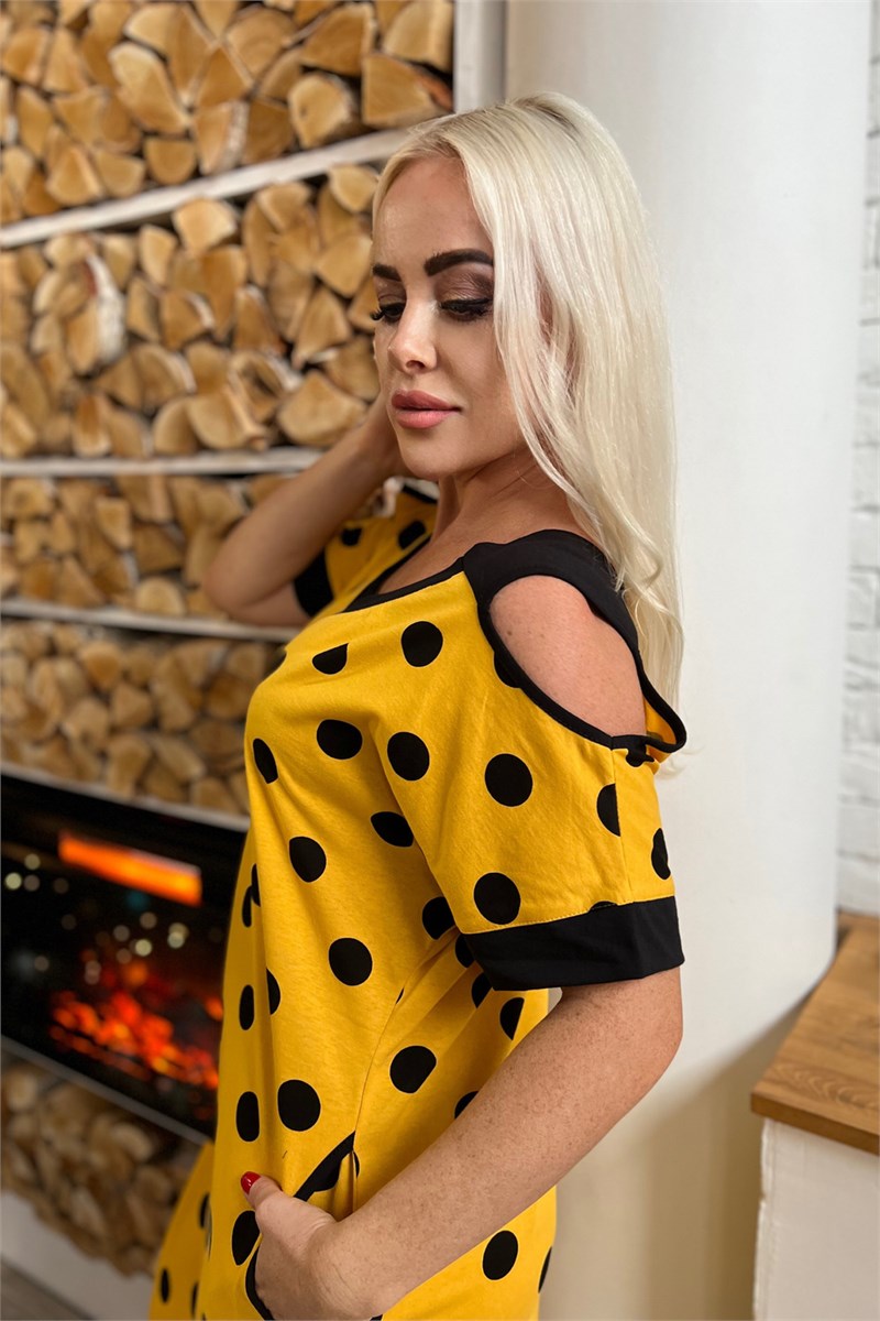 Платье женское с V-образным вырезом, рукава с открытым плечом, по низу рукавов планка, по низу изделия разрезы.