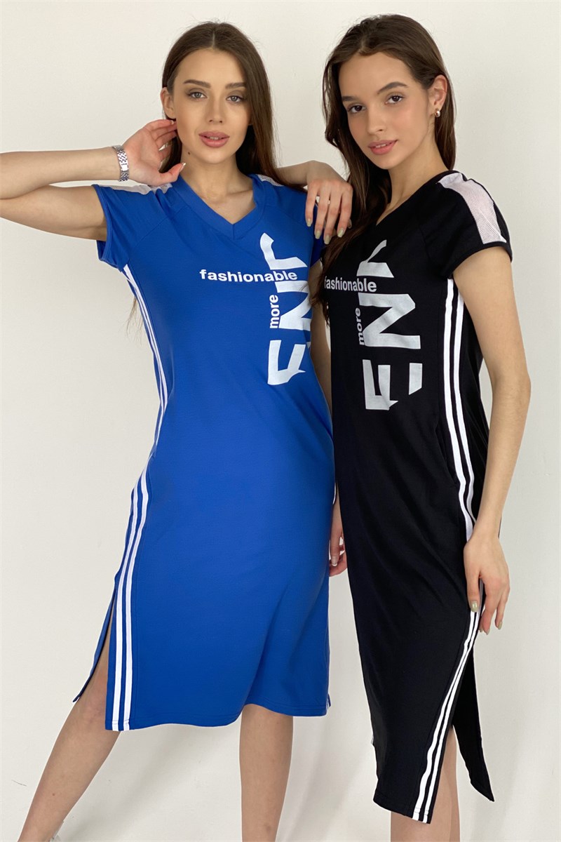 Платье полуприлегающего силуэта, длинное, с V-образной горловиной, с боковыми карманами. Рукав реглан, короткий, со вставкой из сетки. Полочка с лампасами контрастного цвета вдоль боковых швов. В нижней части боковых швов обработаны разрезы. Горловина обработана обтачкой, рукава обработаны бейкой из основного полотна.