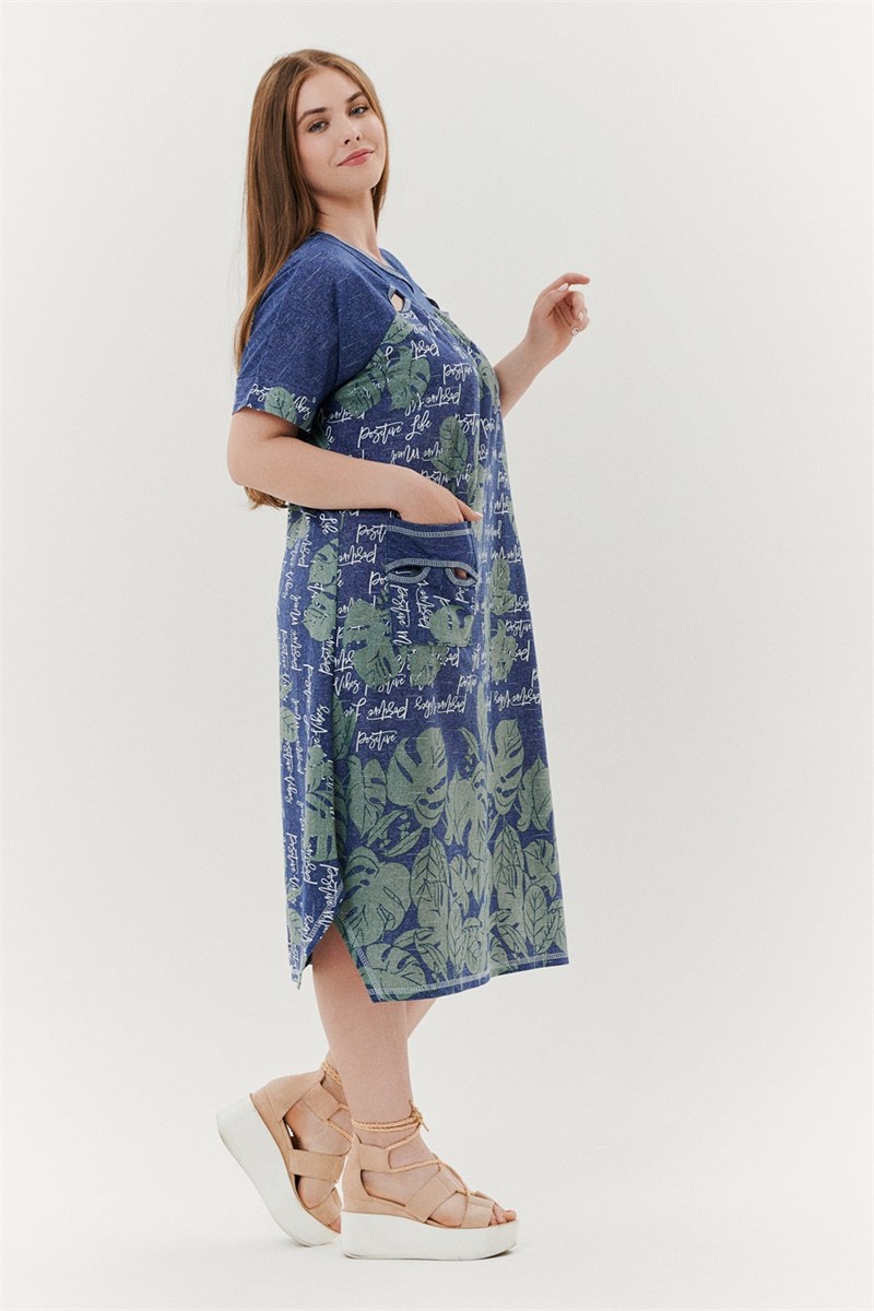 Платье женское, расширенное к низу. Рукав реглан, короткий, на манжете. По горловине - обтачки, в шве притачивания рукава к полочке в области обтачки, разрез в форме листка. На полочке накладные карманы, с обтачкой и разрезами. Боковые швы внизу платья срезаны под углом.