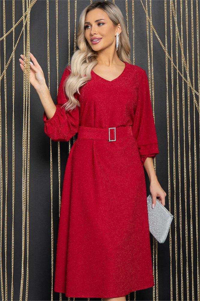 Привлекательное платье А-силуэта с втачным рукавом на резинке. V-образный вырез подчеркивает женственность и изящество. Пояс из той же ткани, что и платье, с пряжкой, украшенной стразами, придаёт изделию изысканный и стильный вид. Это платье идеально подходит для особых случаев или вечерних выходов.