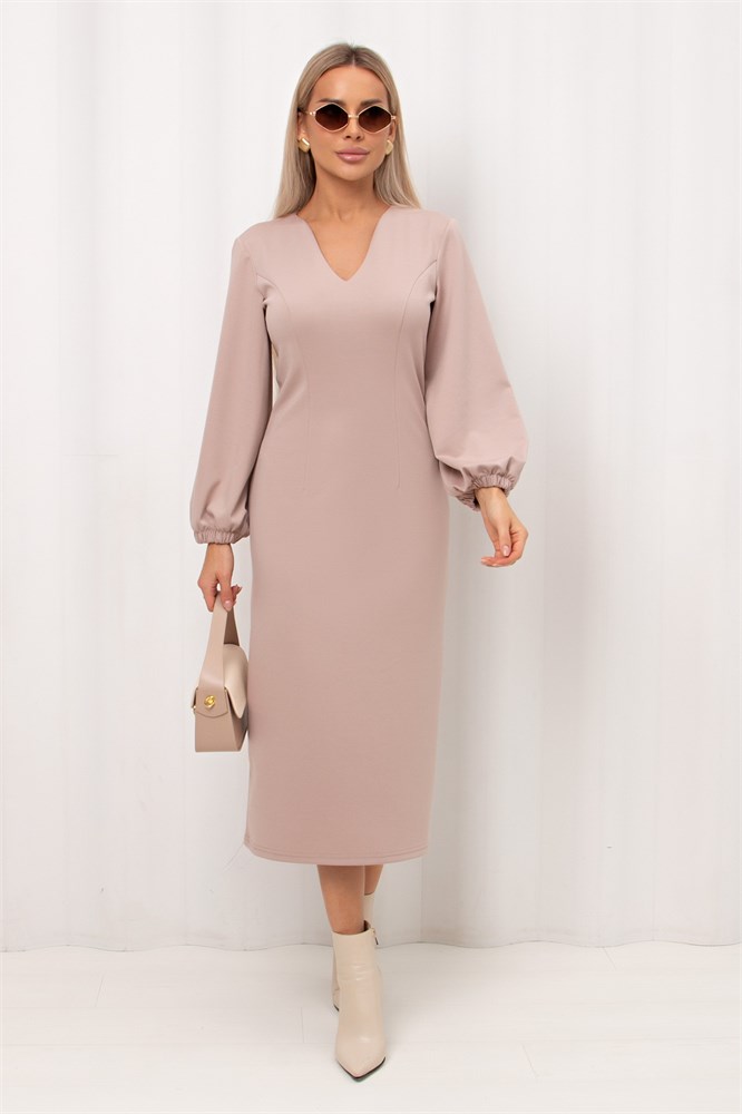 тк Женственное платье полуприлегающего силуэта изготовлено из трикотажного полотна. V-горловина на внутренней обтачке. Длинный втачной рукав по низу присобрен на резинку. По среднему шву спинки застежка на потайную молнию. Низ ровный, сзади разрез. Рекомендуемая стирка при t не более 30°. Длина изделия: 117 см Длина рукава: 55 см Рост фотомодели: 168 см Размер фотомодели: 42 Ткань: трикотаж