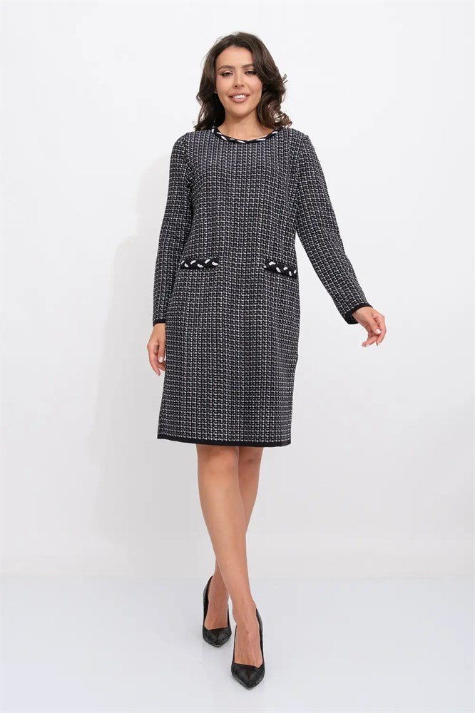 Женское вязаное платье полуприлегающего силуэта с круглой горловиной и карманами. Трикотажное платье выполнено из высококачественной пряжи с составом 30% хлопок, 70% ПАН. Классическое платье имеет круглую горловину и функциональные накладные карманы. Модель выполнена жаккардовым структурным переплетением, образующим рисунок клетка. Круглая горловина платья и линия входа в карман декорирована косами, из переплетающихся декоративных шнуров. Праздничное платье полуприлегающего силуэта подойдет для любого типа фигуры и составит лаконичный образ.