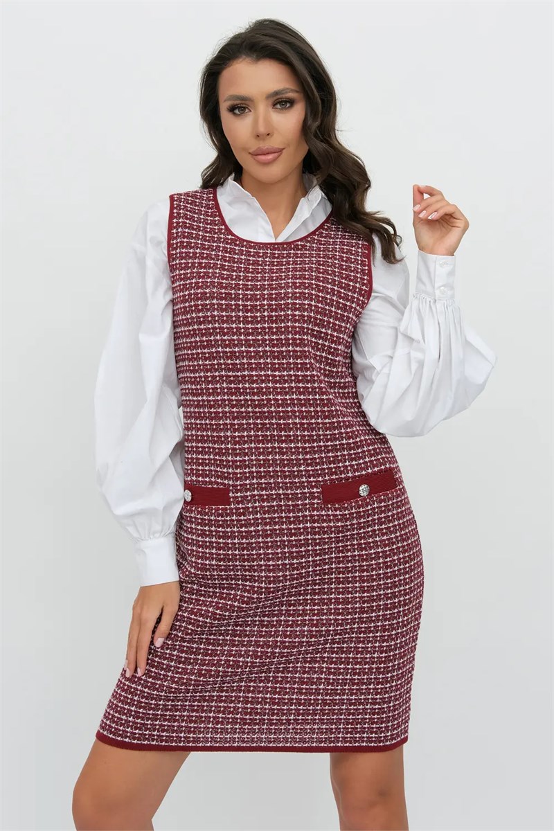 Вязаное женское платье-сарафан полуприлегающего силуэта. Два кармана с листочкой и пуговицей. Выполнено жаккардовым структурным переплетением рисунок клетка. Платье-сарафан для офисного, повседневного и делового стиля, будет отлично сочетаться с водолазками, рубашками, блузками, джемперами или футболками.