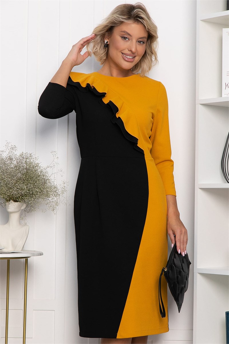 Артикул: П12748-35М. Тип ткани: смесовый. Состав: 65% полиэстер, 30% вискоза, 5% эластан. Материал: трикотаж. Цвет: чёрно-жёлтый. Принт: отсутствует. Длина: миди. Вид застежки: без застежки. Силуэт: приталенный. Карманы: отсутствуют. Подкладка: отсутствует. Декоративные элементы: на лифе платья двойной волан, жёлтая вставка. Длина по спинке от верхней точки плеча: 42/ 106 см, 44/ 107 см, 46-48/ 108 см, 50-52/ 110 см. Размер изделия на модели: 44. Рост модели: 168 см. Роскошное платье, спереди комбинированное из двух цветов создающая свою уникальность, за счет двойного волана на лифе. Модель имеет рукава 3/4 и может стать достойным повседневным нарядом на осень и зиму для девушек, любящих выглядеть элегантно в любой ситуации – на вечеринке и на работе. Уход за изделием: ручная стирка до 30 градусов; нельзя отбеливать; отжим запрещён; гладить при t не более 110 С; гладить с изнанки. Внимание! Рекомендуем ориентироваться на размерную сетку и выбирать свой привычный размер, согласно размерной таблице. *Допуск отклонения длины при массовом производстве 1-3 см является нормой.