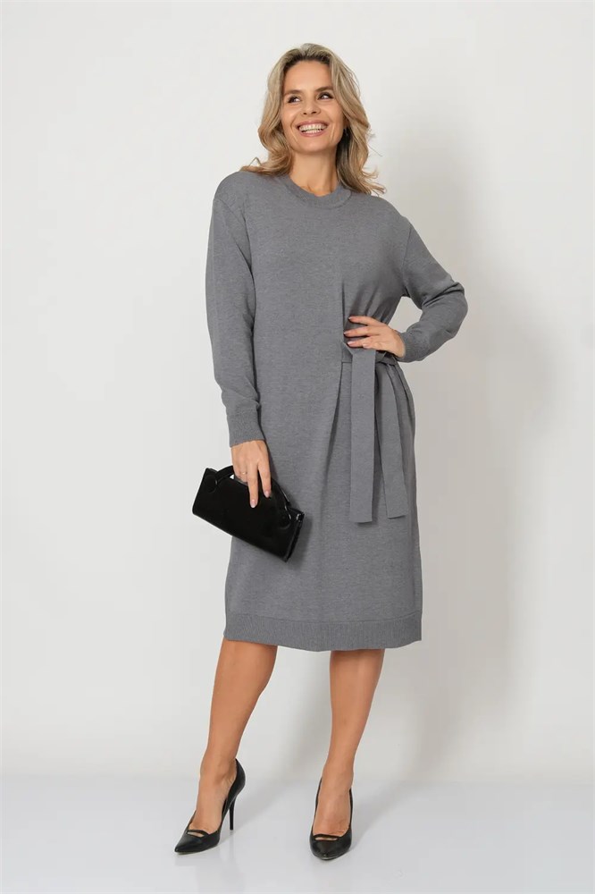Вязаное платье женское полуприлегающего силуэта. Спущенное плечо, рукава длинные, круглая горловина. Пояс пришивной, позволяющий создать элегантную драппировку.