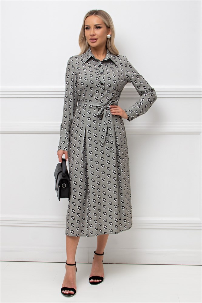 Женственное платье приталенного силуэта. Горловина оформлена отложным воротником на стойке. По переду втачная планка с застежкой на петли и пуговицы. Длинный втачной рукав оканчивается притачной манжетой. Модель отрезная по линии талии, с боку застежка на потайную молнию. Юбка дополнена встречными складками. Пояс из основной ткани в комплекте.