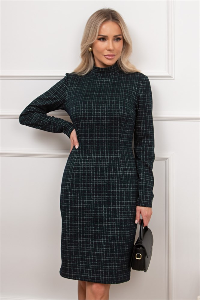 Лаконичное платье прилегающего силуэта выполнено из трикотажного полотна. Длинный втачной рукав. Горловина оформлена воротником - стойка. По спинке застежка на потайную молнию. Низ ровный, без разрезов.