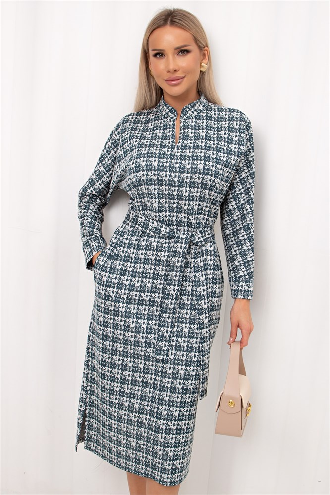 Лаконичное платье прямого силуэта выполнено из трикотажного полотна. Длинный цельнокроеный рукав летучая мышь, оканчивается притачной манжетой. Горловина оформлена воротником - стойка. По переду застежка на потайную молнию. По боковым швам расположены функциональные карманы. Низ ровный, по бокам разрезы. Пояс из основного материала в комплекте. Рекомендуемая стирка при t не более 30°. Длина изделия: 110 см Длина рукава от горловины: 65 см Рост фотомодели: 168 см Размер фотомодели: 42 Ткань: Трикотаж жаккард