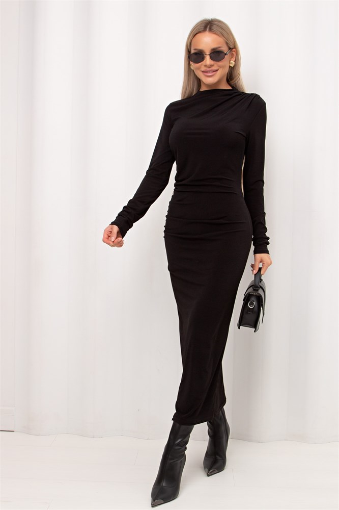Вечернее платье облегающего силуэта выполнено из легкого трикотажного полотна. Цельнокроеная стойка. По плечу и по боку заложена драпировка. По спинке застежка на потайную молнию. Рекомендуемая стирка при t не более 30°. Длина изделия: 131 см Длина рукава: 66 см Рост фотомодели: 168 см Размер фотомодели: 42 Ткань: трикотаж- масло.