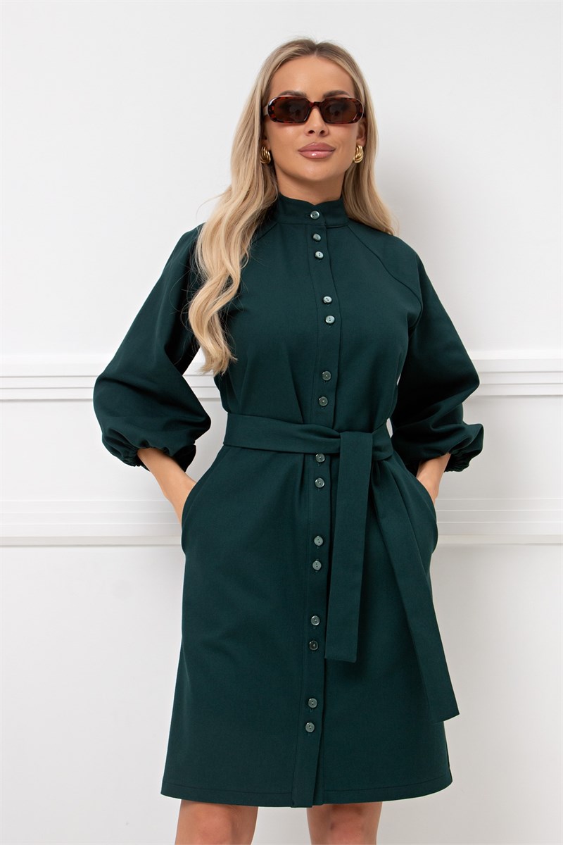 Стильное платье прямого силуэта выполнено из ткани "джинса". Рукав-реглан длиной 3/4 присборен на эластичную резинку. Горловина оформлена воротником-стойка. По переду планка с застежкой на петли и пуговицы. В боковых швах функциональные карманы. Низ ровный, без разрезов. Пояс из основной ткани в комплекте. Пояс пришит для того, чтобы в процессе примерки не потерялся. Он легко отпарывается. Рекомендуемая стирка при t не более 30°. Длина изделия: 96 см Длина рукава от горловины: 57 см Рост фотомодели: 168 см Размер фотомодели: 42 Ткань: Джинса