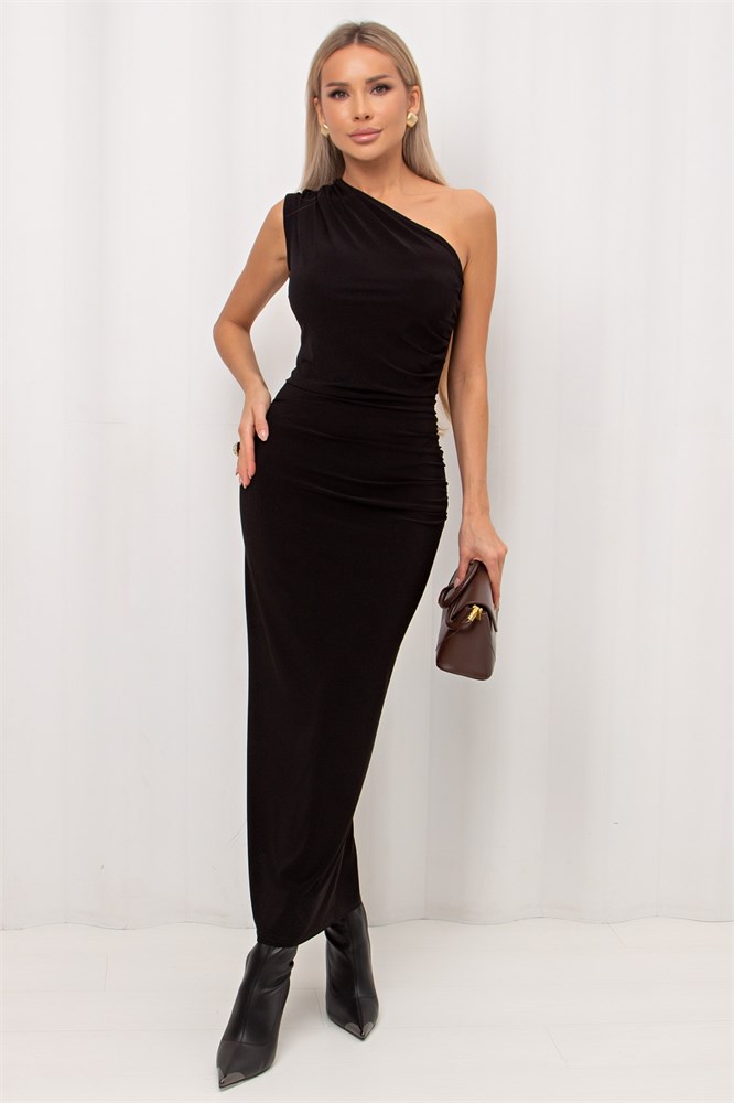 Вечернее платье облегающего силуэта выполнено из легкого трикотажного полотна. Платье на одно плечо, с драпировкой. С боку по ноге разрез. Рекомендуемая стирка при t не более 30°. Длина изделия: 135 см Рост фотомодели: 168 см Размер фотомодели: 42 Ткань: трикотаж- масло.