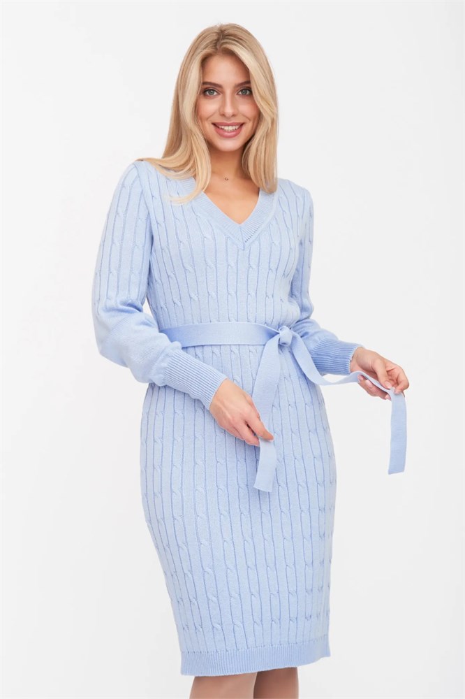 Трикотажное платье облегающего силуэта длиной до колена с V-образным вырезом. Рукава втачные длинные. Платье выполнено переплетением, образующим вертикальные тонкие косы. Изделие в комплектации с поясом.