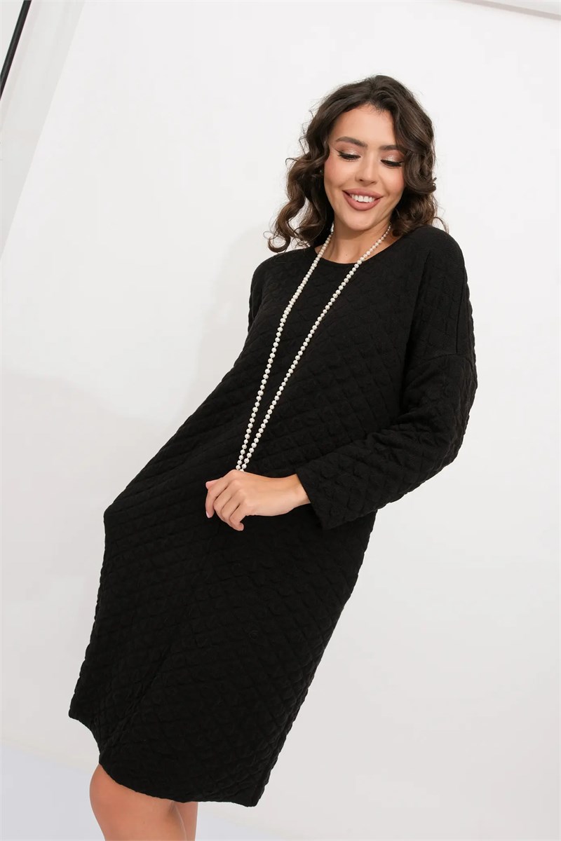 Женское трикотажное платье свободного силуэта. Вырез горловины круглый, рукава втачные длинные со спущенным плечом. Платье выполнено жаккардовым переплетением, образуя диагональные немного выпуклые ромбы.